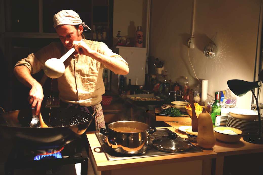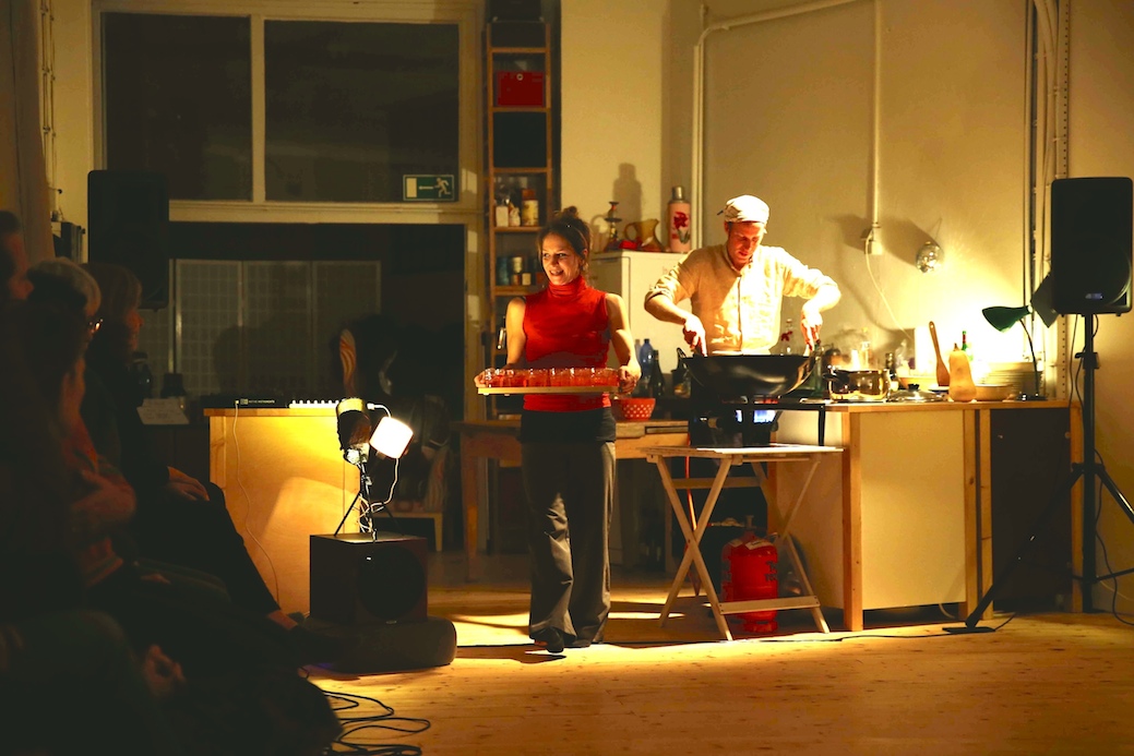 Im weiteren Verlauf des Abends wird Andi Otto – im Wechsel von Gesprächen mit den Gästen und Tanz-, Sound- und Bild-Aktionen der Tänzer_Innen – live ein Risotto zubereiten. Damit beziehen sich Choreografin und Musiker auf ihre gemeinsame Performance „LET IT HUM – ein hauserwärmendes Ritual“ (2016), zu dem Victoria Hauke in ihr privates Studio einlud. Alles läuft hinaus auf ein gemeinsames Essen mit den Gästen: Stühle werden an eine einzige lange Tafel geschoben und der letzte (uninszenierte) Teil des Abends beginnt: open end…
