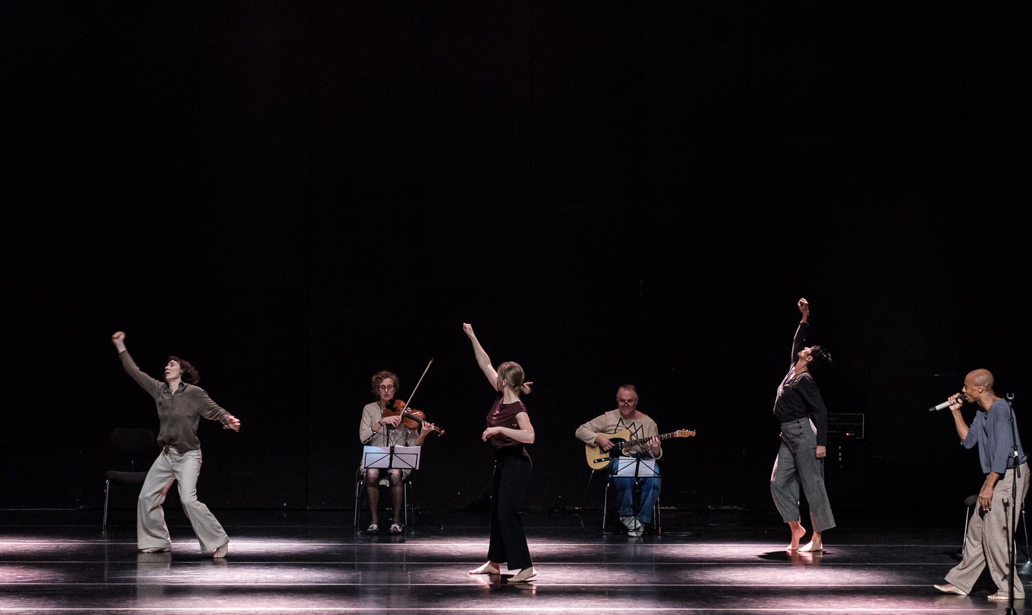 Ihre aktuellen spartenübergreifenden Arbeiten sind künstlerisch formulierte Vorhaben, die im Kollektiv erarbeitete choreografische Methoden als ein mögliches gedankliches Model für funktionale Formen des Zusammenseins vorschlagen und begreifen. Sie sind Auseinandersetzungen mit der choreografischen Praxis, die selbstbestimmtes Handeln, gemeinschaftliche, synchrone (Bewegungs-) Strukturen, aber auch deren Abweichungen respektieren - performative Reflexionen über aktuelle Veränderungen unseres Zusammenseins und eine künstlerische Vision über den Umgang mit diesen.