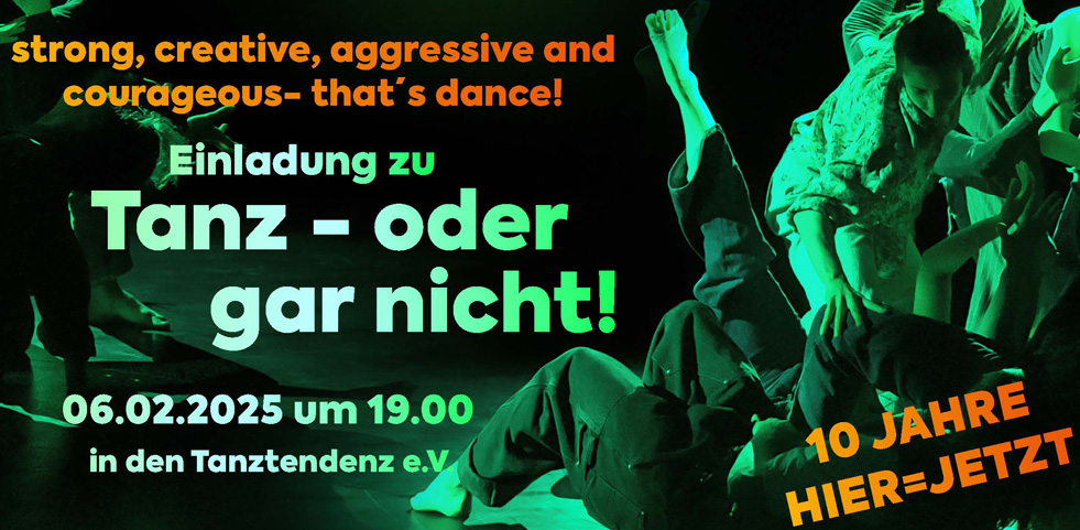 06. Februar 2025 / 19:00 10 Jahre HIER=JETZT Tanz – oder gar nicht Tanztendenz München Ein Gespräch mit den Initiatorinnen von HIER=JETZT u. jungen Künstler:innen |
